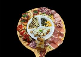 TAGLIERE EL PATRON CRUDO PARMA SALAME NAPOLI SALAME PICCANTE FORMAGGI MISTI MONTANARA AL RAGU VERDURE GRIGLIATE CROSTINI AL GORGONZOLA OLIVE VERDI LUPINI GIALLI PANCETTA ROTONDA